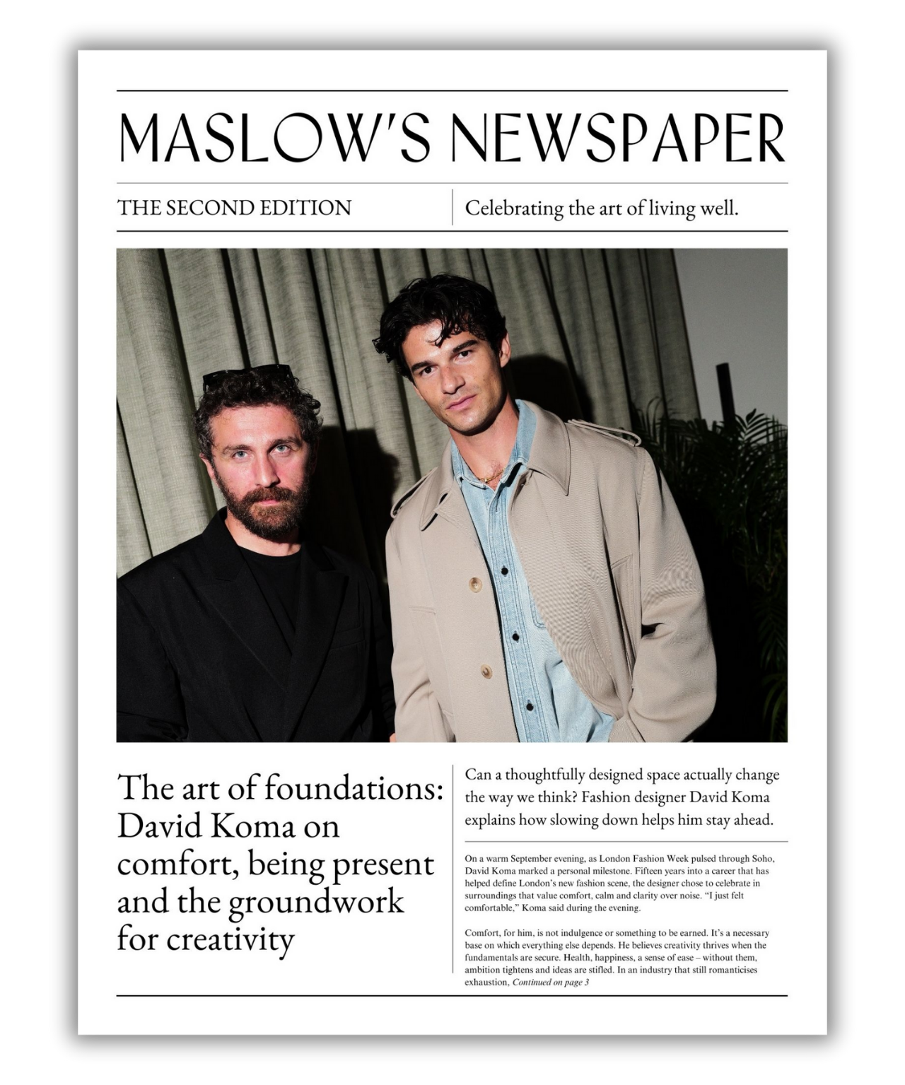 Maslow’s Newspaper is a seasonal publication created for the Maslow’s collection of private members’ houses. Produced as a considered, tactile object, it reflects the rhythm of the year and the character of each house, offering members a thoughtful companion to life inside — and beyond — Maslow’s spaces.